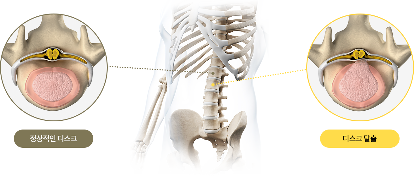 허리 디스크의 정확한 질환명은 “요추간판 탈출증”이며 디스크 조직이 외부적 충격 등의 원인으로 파열되어
